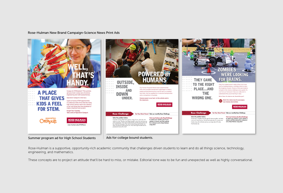 I’ve had the great fortune to work on some truly inspiring projects while meeting many influential and creative individuals along the way. My time at Rose-Hulman Institute of Technology as their Creative Director and Brand Manager was inspirational. Many successes and many awards have been due to a fantastic team of writers, designers, photographers, and videographers. At Rose, I developed and implemented a new brand standard for the institute that included, logos, marketing materials, digital marketing, web, magazine, banners, and marketing promo items. Please get in touch with me if you would like to know more.